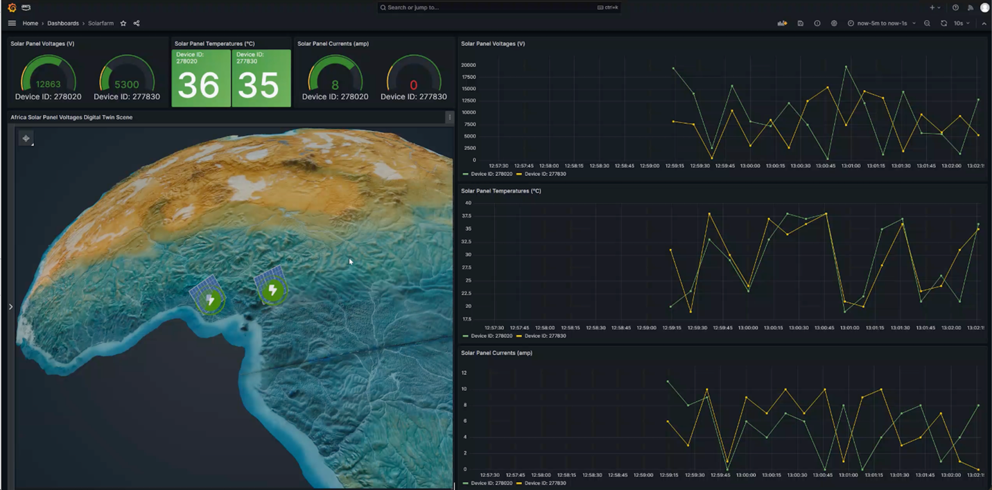 Figure 2. Screenshot of a dashboard tracking real-time sensor data from solar panel grids in sub-Saharan Africa. The dashboard is tracking voltage, temperature, and currents of solar panels.