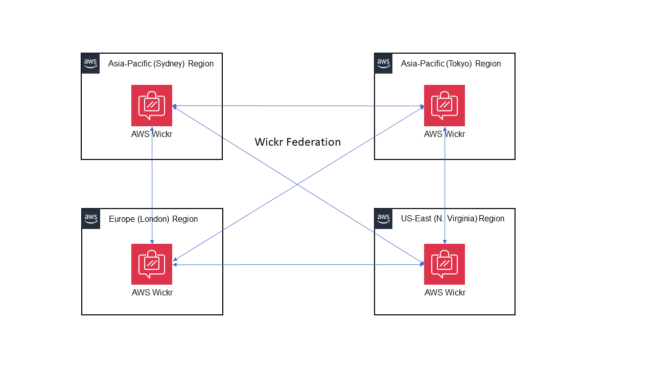 Figure 1. Wickr federation between the AWS Sydney, London, Tokyo, and Northern Virginia Regions.