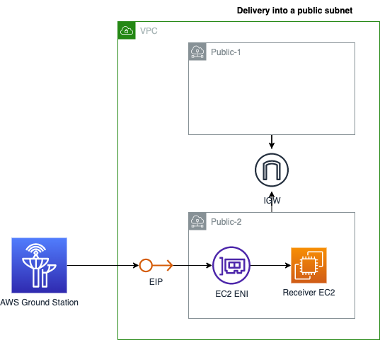 Figure 2. Architectural diagram of a receiver Amazon EC2 instance deployed into a public subnet. AWS Ground Station sends Wideband DigIf data to the Elastic IP, associated with an ENI associated with a public subnet.