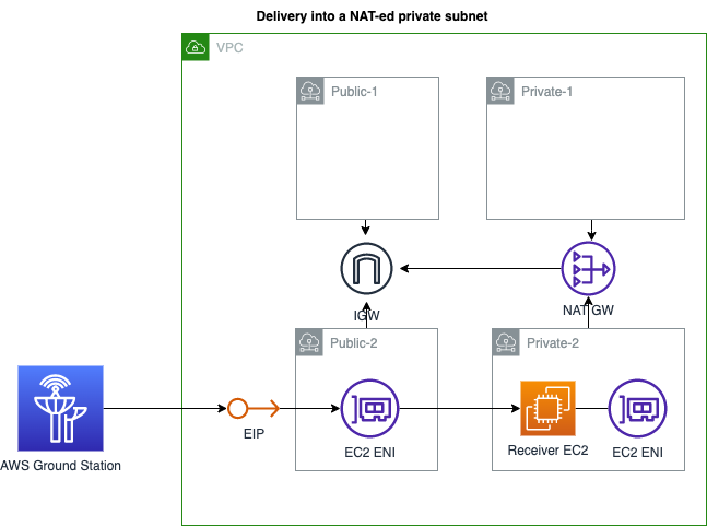 Figure 3. Architectural diagram of a receiver Amazon EC2 instance deployed into a private NAT-ed subnet. AWS Ground Station sends Wideband DigIf data to the