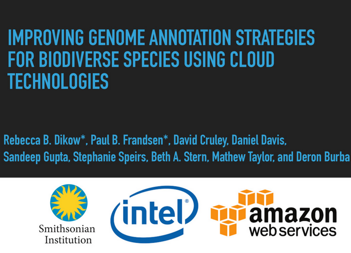 Rebecca Dikow presented the team’s progress at the first Global Biodiversity Genomics “BioGenomics” conference held in Washington DC , which was hosted by the Smithsonian Institution. This conference was a gathering of more than 300 genome and biodiversity scientists that focused on the methods and analysis of biodiverse genome data. There was great interest in the annotation pipeline currently under development. Check out the “Improving genome annotation strategies for biodiverse species using cloud technologies” slide deck presented at the conference here.
