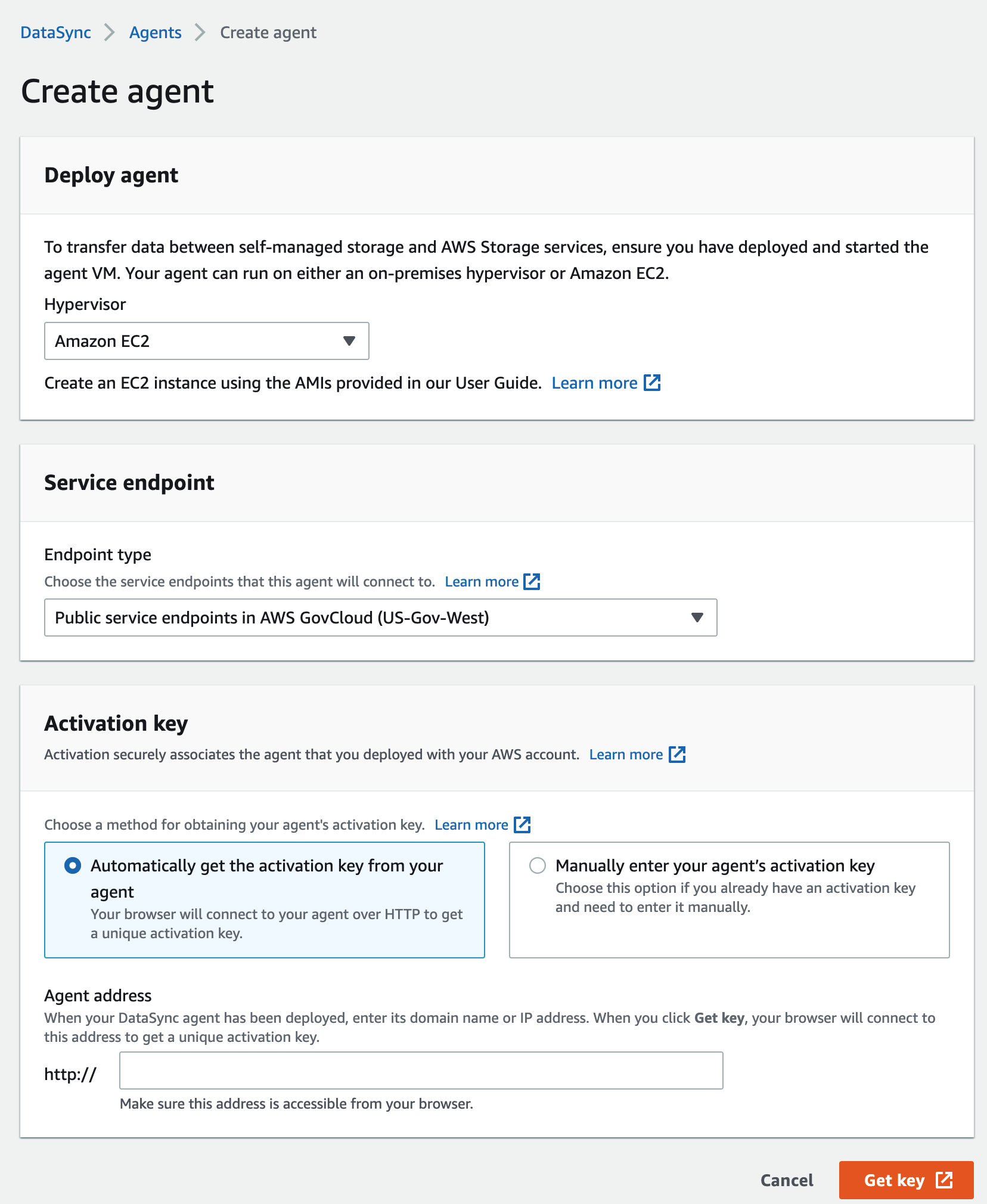 In the AWS GovCloud (US) account, navigate to AWS DataSync in the AWS Management Console and select Getting Started. Now set up our agent: