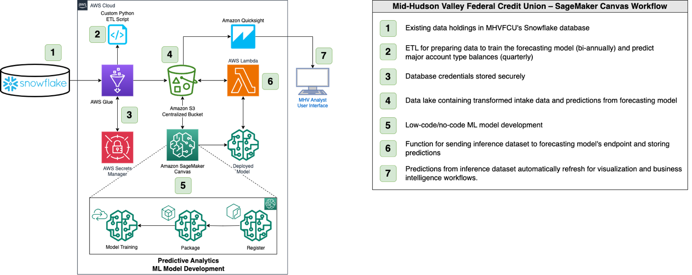 MHVFCU implemented an end-to-end solution using several AWS services including AWS Glue, and Amazon Simple Storage Service (Amazon S3) for data ingestion, Amazon SageMaker Canvas for model development, and Amazon QuickSight for data visualization and business intelligence (BI). The solution architecture allowed MHVFCU to: