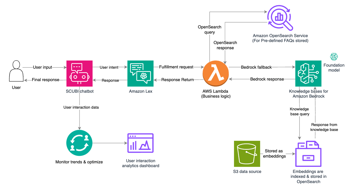 - The user sends input to the SCUBI chatbot, which forwards it to Amazon Lex for natural language understanding and intent processing.
