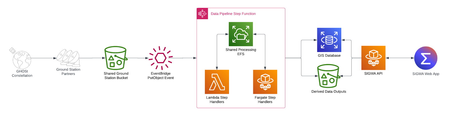 OSK leverages AWS serverless computing technology to operate a scale-to-zero data pipeline that can process new satellite data within a few minutes of it being received on the ground. When data is received from OSK’s ground station partners in Amazon Simple Storage Service (Amazon S3), this activates an Amazon EventBridge event to start the data pipeline, which processes the data using AWS Step Functions to coordinate AWS Lambda functions and AWS Fargate tasks to process all the received data in parallel. Once the data is processed, all these resources scale back down to zero. This serverless architecture on AWS serverless enables OSK to quickly scale up large amounts of compute when OSK’s satellites transmit data to its ground station partners and scale down while they’re in the rest of their orbit.
