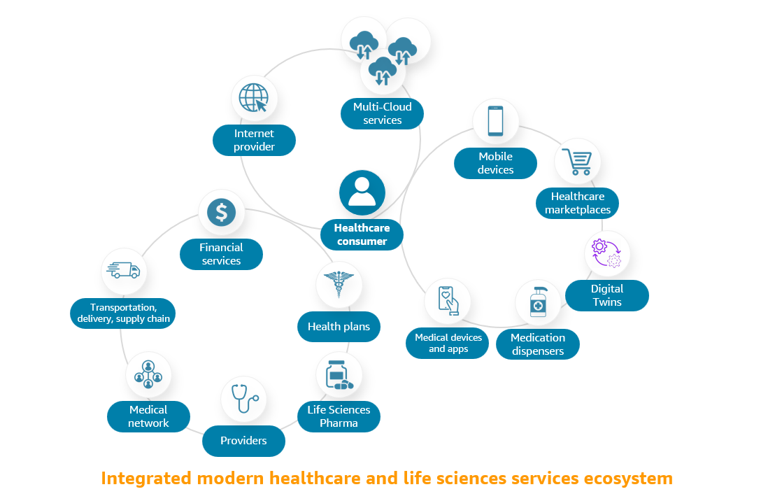 The following diagram shows the modern integrated healthcare and life sciences services ecosystem, which is a network of traditional providers, health plans, pharmacies, and other brick-and-mortar care organizations coupled with cloud service providers and new digital marketplaces, connected medical devices, and of course the healthcare consumer. This ecosystem must be data-driven and, in turn, creates the data that can power innovative and modern generative AI applications for health and life sciences.