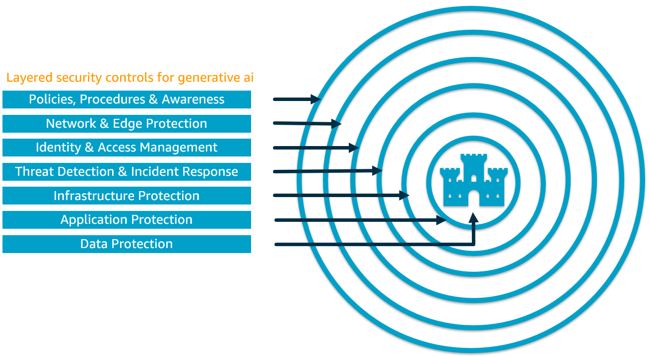 To address these challenges, healthcare organizations must start by adopting a defense-in-depth strategy, using the layered security services offered by AWS and its partners. This multilayered approach uses AWS services and solutions to enhance overall security and resilience and better protect generative AI environments and workloads. As explained in Architect defense-in-depth security for generative AI application using the OWASP Top 10 for LLMs in the AWS Machine Learning Blog, defense-in-depth security best practices can mitigate many of the common risks that any workload faces, helping accelerate generative AI innovation. The AWS Machine Learning Blog post recommends following the defense-in-depth model to help address and mitigate the common security concerns and risks that can undermine trust in AI, as identified by the Open Worldwide Application Security Project (OWASP) Top 10 for LLM Applications. The following graphic shows the seven layers that make up the defense-in-depth approach: