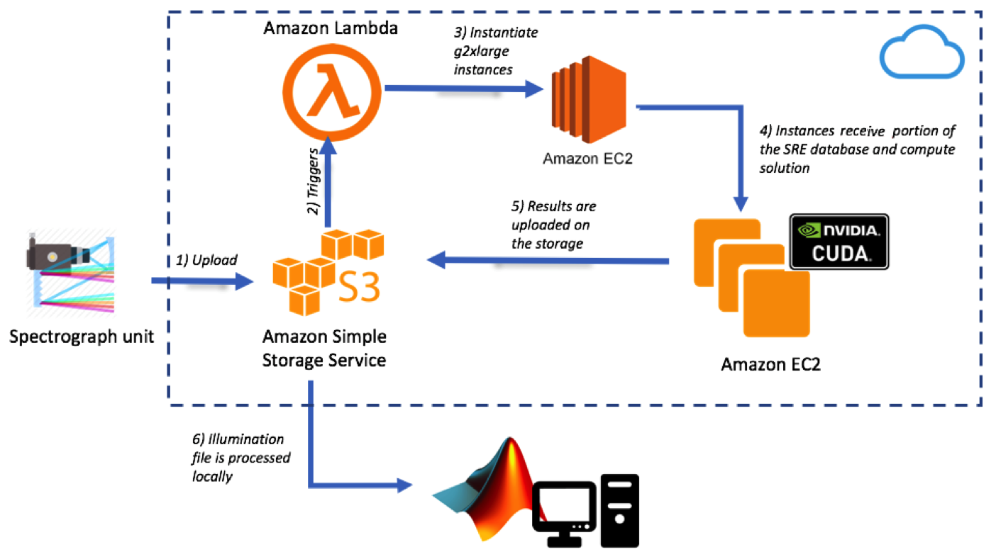 Figure 1 – AWS Architecture for ESO-HiReS simulation. Input coming from the spectrograph design are uploaded to Amazon S3. Then, AWS Lambda initiates EC2 g2x.large instances to perform a CUDA simulation and then the results are stored back on S3.