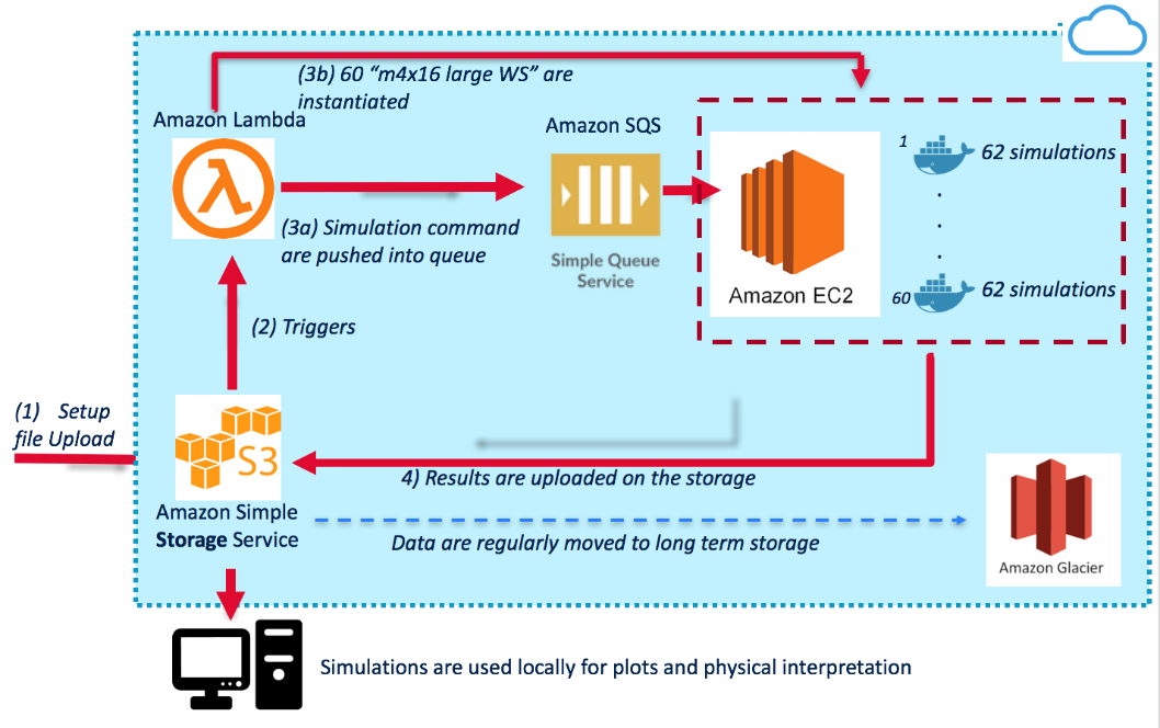 Figure 2 – AWS architecture for CTA simulations. As in the case of HIRES, the architecture provides triggers from S3 as soon as the input for simulations are uploaded. An Amazon SQS FIFO queue is used to dispatch simulations between EC2 instances. Then, the processed data is sent back to S3. They make use of Docker to containerize the software and Amazon Glacier for long-term storage.
