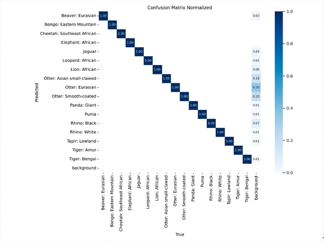 Working alongside AWS Partners Provectus and JMP Statistical Software, WildTrack developed a multi-species footprint-powered model, achieving over 90% accuracy across 17 species. The confusion matrix below demonstrates excellent classification accuracy even with extremely similar sub-species of otter.