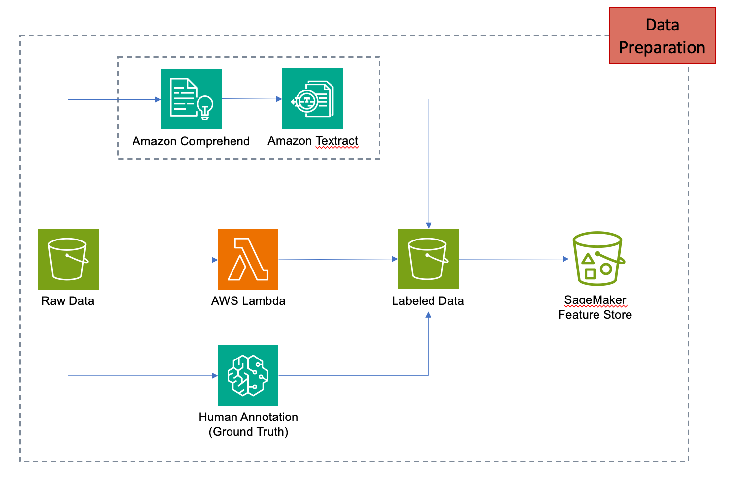 Figure 1. Architecture diagram of data preparation. The major components are Amazon Comprehend and Amazon Textract to digest and prepare the data, Lambda to orchestrate the overall functions, Amazon Simple Storage Service (Amazon S3) for storage, and the feeding into SageMaker Feature store.