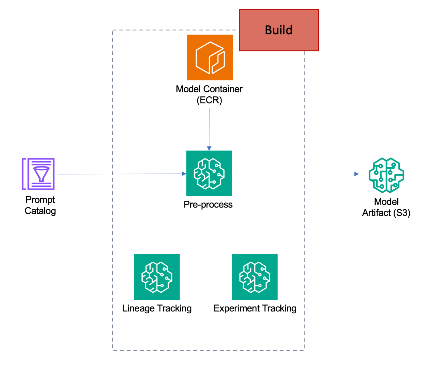 Figure 2. Architecture diagram of model for building. The major components are Amazon Elastic Container Registry (Amazon ECR) for container services, Amazon S3 for storage, and SageMaker. You also have different options to choose from for prompt catalog storage.
