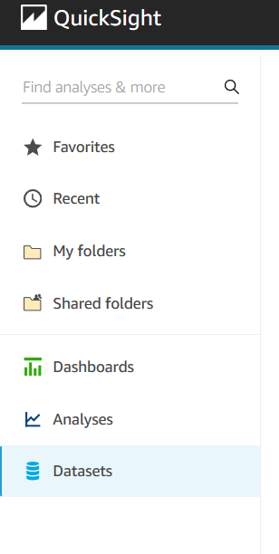 1. From the Amazon QuickSight landing page, select the Datasets button on the left hand side.