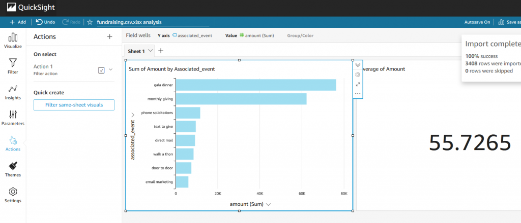 In this blog post, I shared a few features in Amazon QuickSight that can help your nonprofit’s journey to data-driven fundraising decisions. Amazon QuickSight has the power to help you enhance your nonprofit’s fundraising operations by allowing you to better visualize and present your data in meaningful ways, and supporting your organization in making faster and more intentional data-driven decisions. With features such as extensive data connectivity options, AutoGraph, filtering, and suggested insights, Amazon QuickSight allows users to get to their first insight within minutes with little to no training required. These capabilities empower your nonprofit to move from static spreadsheets and data silos to interactive, actionable data insights.