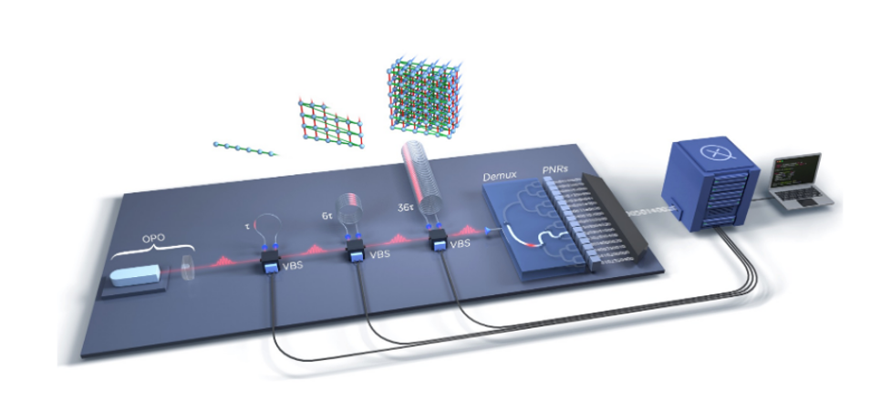 Borealis is designed to do exactly that. A single laser source creates a train of 216 phase-locked, identical pulses of light with a 6 MHz clock rate. Each pulse, also referred to as a qumode, is squeezed, i.e., prepared in a quantum mechanical state that exhibits distinct characteristics in the photon number distribution. The qumodes, only distinguishable by their respective time signature, are then injected into a sequence of dynamically programmable, loop-based interferometers. These interferometers are at the heart of the GBS experiment, enabling entangling gates between the qumodes: Programmable beam splitters and phase shifters can be set to selectively route qumodes into optical delay lines so they interfere with subsequent pulses, a strategy called temporal multiplexing. As shown in Figure 1, using three different length delay loops (1τ, 6τ, and 36τ, where τ=167 ns), qumodes across the pulse train can be entangled. The first loop (1τ), hereby interferes two neighboring pulses, the second loop (6τ) interferes two pulses that are separated by 6 time steps, and the third loop (36τ) interferes two pulses that are separated by 36 time steps. This non-local interaction allows for the creation of complex quantum mechanical states which can be illustrated in a 3D array as seen at the top of Figure 1 (each dimension representing 1τ, 6τ, and 36τ gates respectively).