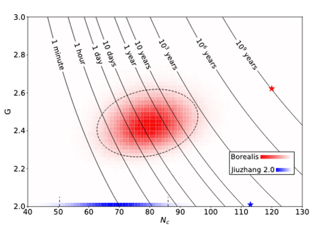 Figure 3: Estimated classical simulation times on Fugaku for the samples generated in the quantum advantage experiment on Borealis (red) and Jiuzhang 2.0 (blue). G and Nc are parameters characterizing the complexity of each sample that increase as the photon count increases. The stars represent the highest complexity samples generated by each of the devices.