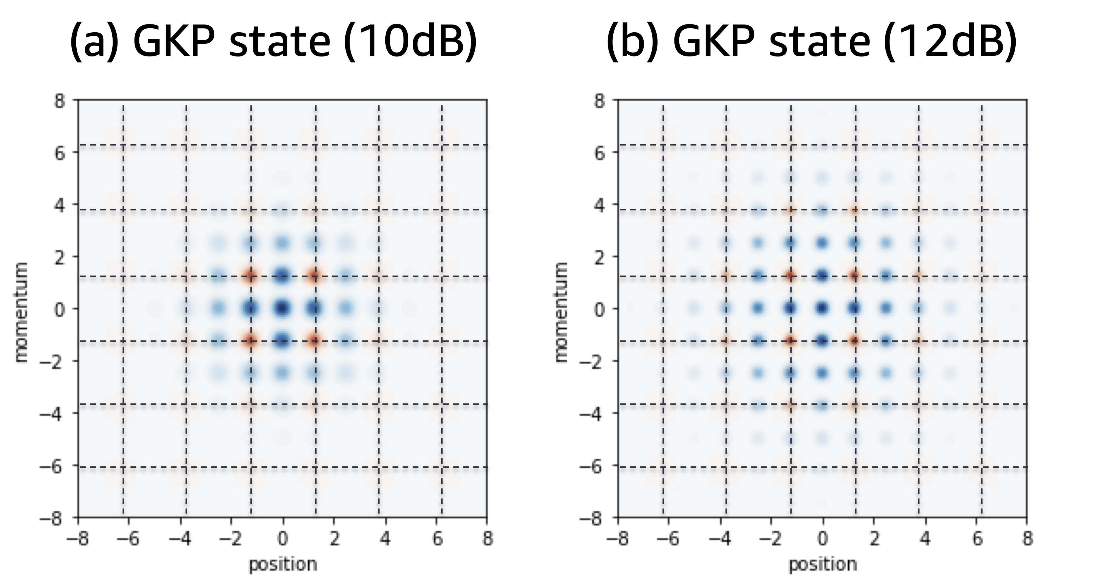 The GKP qubit is named after its inventors Gottesman, Kitaev, and Preskill, and is an example of a bosonic qubit. The key idea behind the GKP qubit is to work around the Heisenberg uncertainty principle. According to Heisenberg’s uncertainty principle, it is impossible to measure both the position and momentum of a particle precisely and simultaneously. This is why even a vacuum state, an oscillator without any photons, has non-zero noise variances in the position and momentum axes (see the Gaussian noise profile in Figure 2a). One way to work around the uncertainty principle is to give up the simultaneity. More accurately, you can reduce the noise variance in the position axis at the expense of an increased noise variance in the momentum axis, hence squeezing the noise (compare Figure 2a with Figure 2b). Note that the extent to which a state is squeezed is conventionally measured in the unit decibel (or dB) due to its close relation to amplification. Compare Figures 2b and 2c to get a sense of what the squeezed states look like at two different squeezing levels (10 dB and 12 dB). So, if you give up measuring the momentum, you can measure the position as accurately as you want.