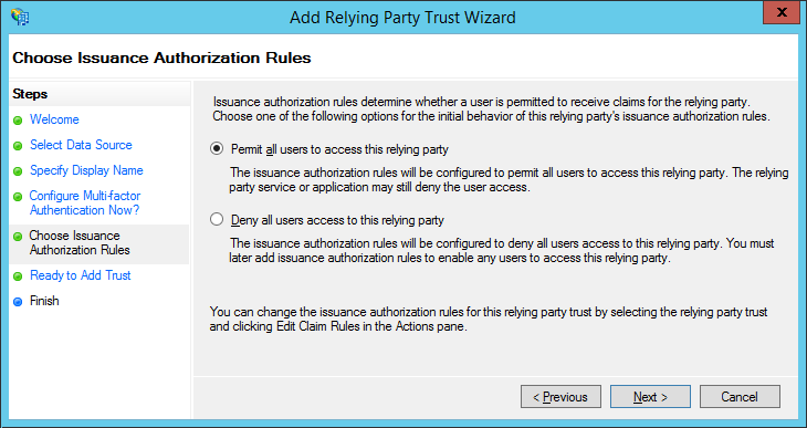 6. Select “Permit all users to access this relying party” and click Next.