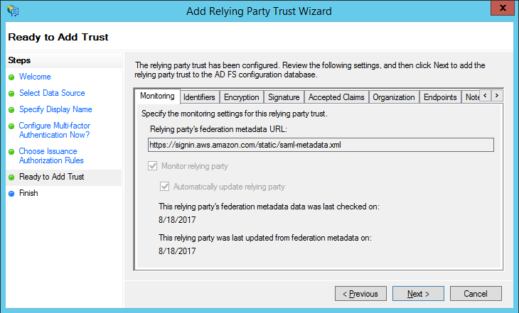 ADFS federation occurs with the participation of two parties; the identity or claims provider (in this case the owner of the identity repository – Active Directory) and the relying party, which is another application that wishes to outsource authentication to the identity provider; in this case Amazon Secure Token Service (STS). The relying party is a federation partner that is represented by a claims provider trust in the federation service.