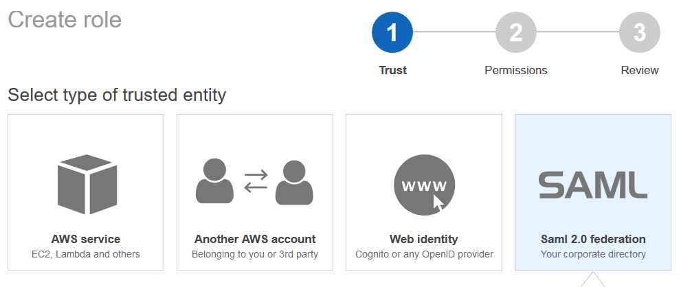 2. Select “SAML” as the trusted entity type. Click Next Step.