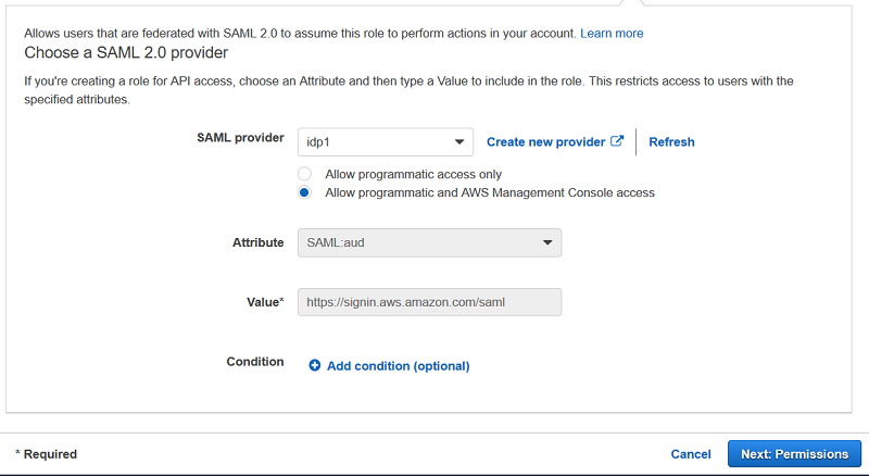 3. Select your previously created identity provider. Click Next: Permissions.