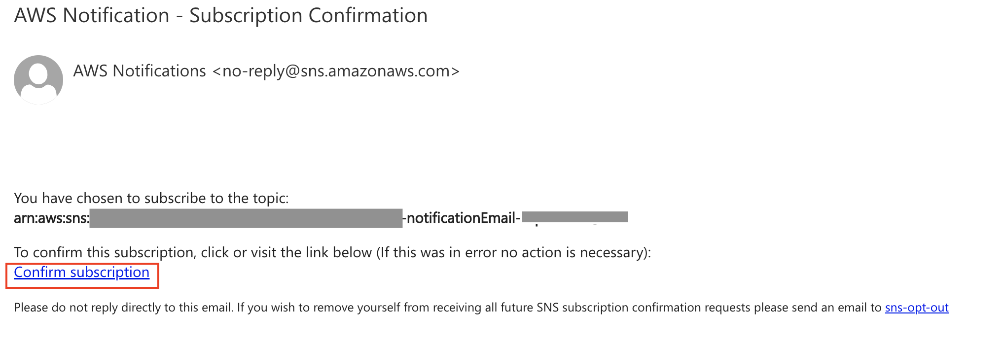 - Check the email address you entered during the deployment stage of this solution for an email sent by no-reply@sns.amazonaws.com, similar to what you see in Figure 6. Follow the steps in the email to confirm the Amazon SNS topic subscription.
