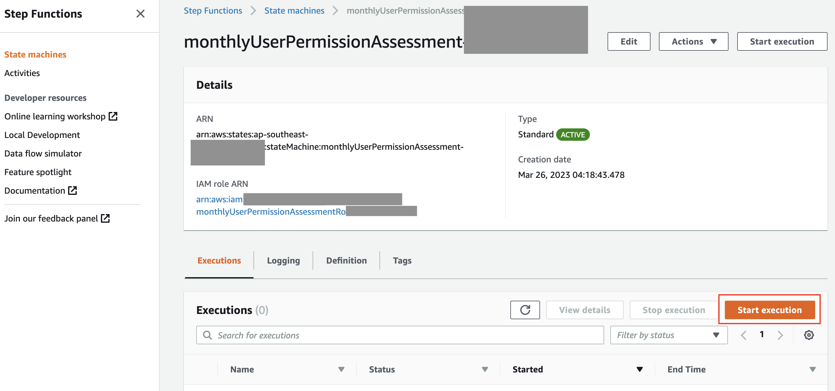 - Select the state machine monthlyUserPermissionAssessment-{randomID} and choose Start execution.