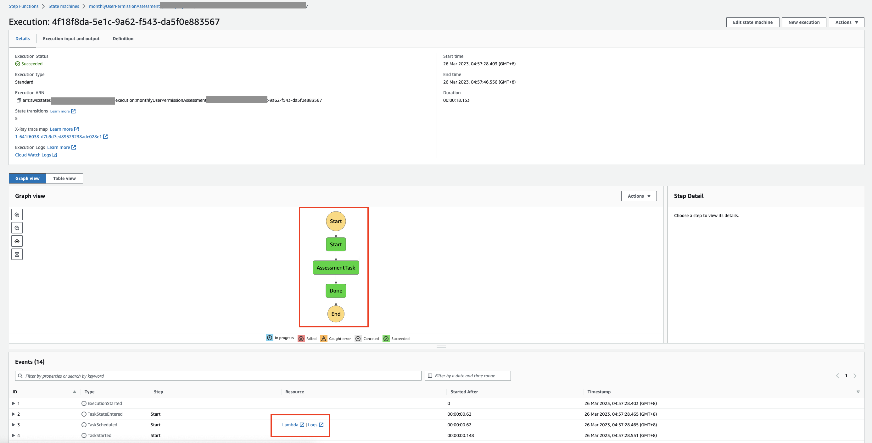 When the process starts, the execution page opens and you can follow the process. The flow turns green when each step has been completed successfully. You can also review Events and check the Lambda functions or logs if you need to troubleshoot or refer to the details.