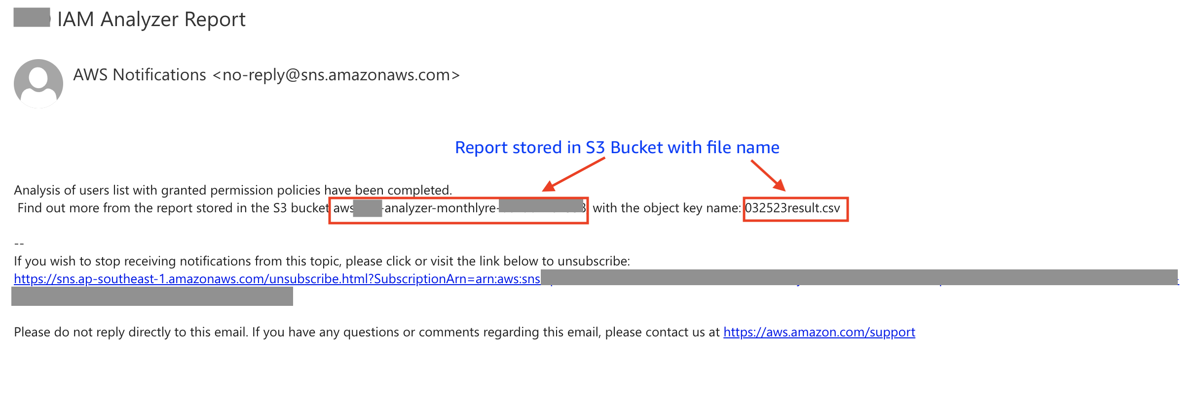 After each successful execution, you should receive an email notification at the email you specified in the Amazon SNS topic. You can then retrieve the report from the S3 bucket with the bucket name {StackName}-monthlyre-{AccountID}. Your report is stored according to the object key name specified in the email. An example of the email notification is shown in Figure 10.