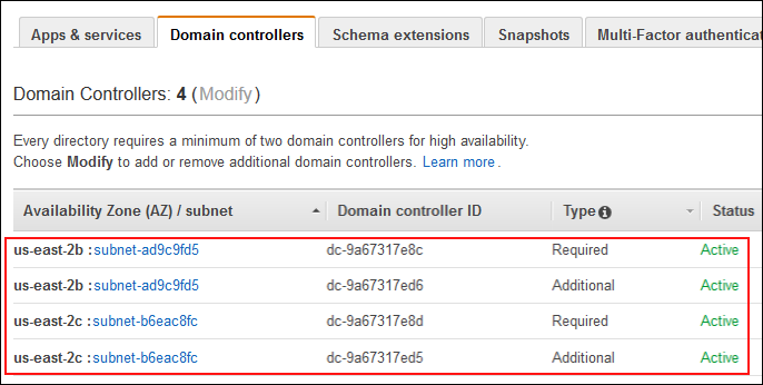 - I choose the Domain controllers tab next. Here I can see the two domain controllers that AWS Microsoft AD created for me in Step 1. It also shows the Availability Zones and subnets in which AWS Microsoft AD deployed the domain controllers.