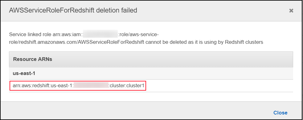 - If you choose View details, you will see a message that explains the deletion failed because there are resources that use the service-linked role.