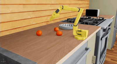 GR00T N1.5 model fine tuned on less than 60 demonstrations with simulatedSO-ARM101 showcases vision-guided manipulation in the leisaac kitchen scene, successfully grasping and placing oranges into a bowl with smooth movements and fault tolerance