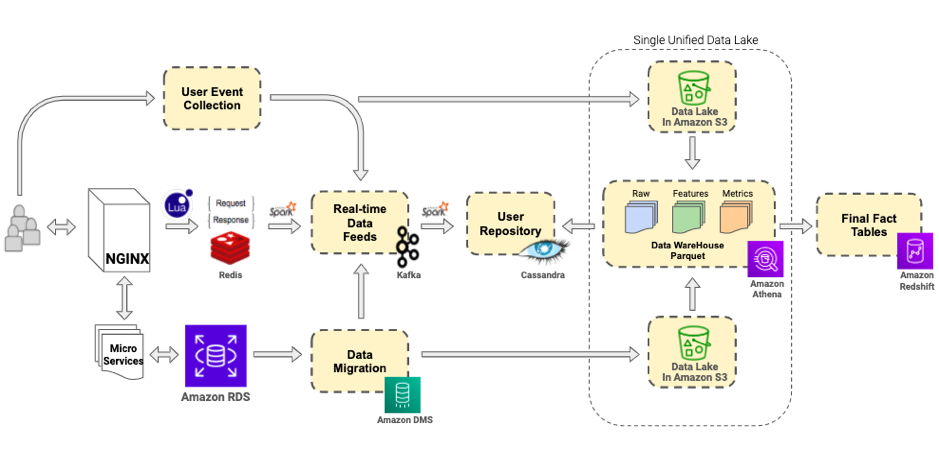 After a thorough evaluation, it was clear to us that a unified data lake would be an appropriate replacement of the existing infrastructure that would store, map, relate and normalize all the facts and dimensions of the data to provide a single source of truth for everything related to a user.
