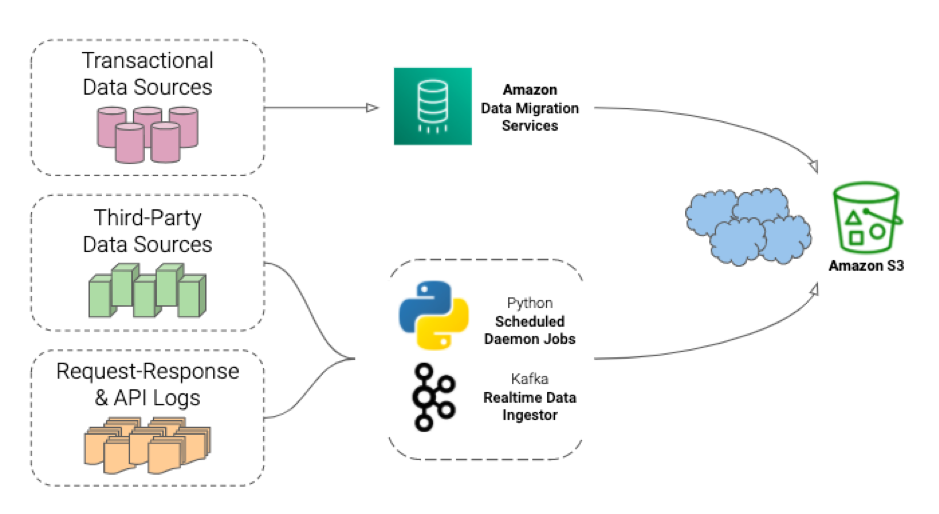 Considering the scale of our efforts, we went ahead with Amazon S3. We decided to fetch and push data from all the transactional databases, third party sources, and request-response logs to specific buckets in Amazon S3. These buckets together created a raw datalLayer for us.