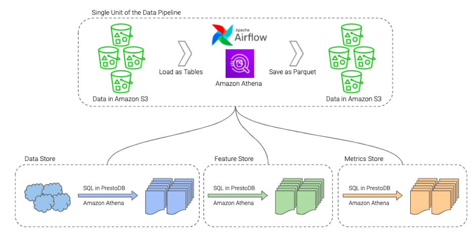 - Data Store – The data in S3 buckets is not immediately useful in the state it arrives. The data from earlier mentioned sources are further subjected to multiple strategies of partitioning and clustering using Amazon Athena CTAS queries.