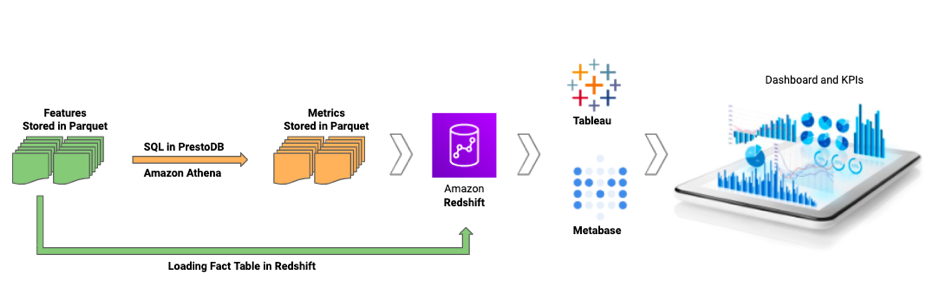 While this slicing and dicing is possible using queries directly on processed and optimized features in the Feature Store, a more flexible approach was needed that allowed tracking KPIs or evaluating model performance on an ongoing/ad-hoc basis. To enable this flexibility, we moved the pre-defined metrics and some final factual data (a subset of features for entities like user, order, vendor, delivery partners etc ) to Amazon Redshift.