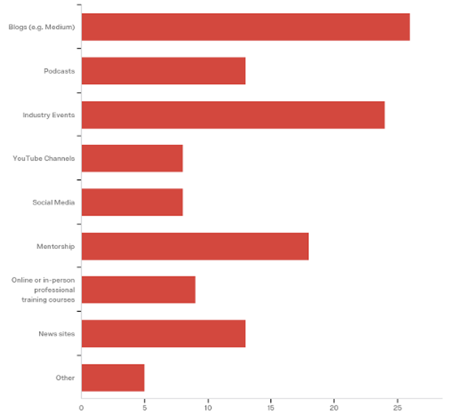 I was curious to understand how startups get their business knowledge today, so I conducted a survey to find out. I asked 40 founders across Europe at all funding stages how they attained their knowledge on how to start, scale, and grow their businesses. Interestingly, blogs and industry events came out on top, followed by mentorship in 3rd.