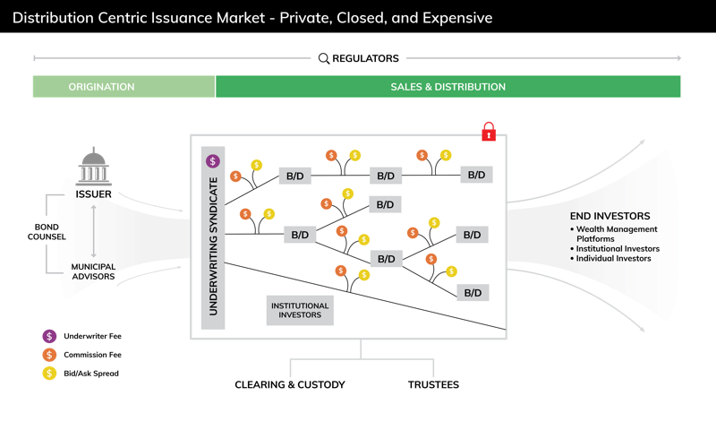 A fundamental aspect of the bond market is the creation of new issues, or origination, which is based on processes established well before modern communication technology. While advancements have been made, such as the creation in the 1960s of a centralized trust and clearing process to address rising volumes of paperwork and security concerns, much of the legacy infrastructure remains in place. Today, underwriters/broker-dealers control primary issuance, purchasing entire offerings directly from municipal issuers and then distributing the bonds through their proprietary sales channels. This is a closed process with limited transparency that we refer to as the “single-pipe distribution system.” The entire framework was designed around a paper-based system and contains significant operational inefficiencies and reconciliation challenges.