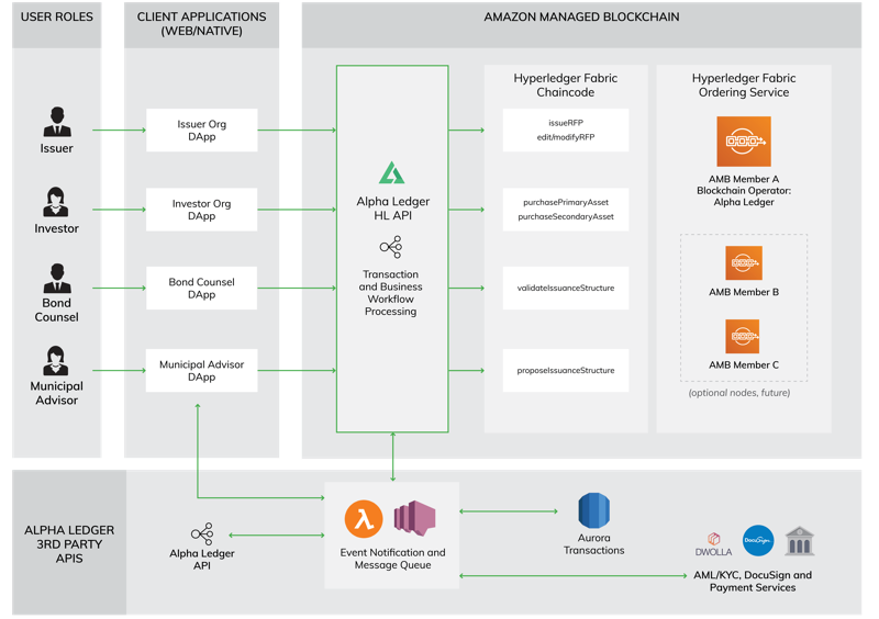 Amazon Managed Blockchain is the foundation upon which Alpha Ledger has constructed its distributed marketplace. Looking specifically at the municipal new issue process, Alpha Ledger’s platform connects many diverse participants into a seamless workflow for quick and efficient raising of funds. For example, municipal advisors and bond counsel, whose approvals are typically required to complete the underwriting process, interact directly with their clients through Alpha Ledger’s Decentralized Apps (DApps). These various roles communicate via the platform’s web and native DApp graphical user interfaces. Each role and DApp have access to a number of chaincode (smart contract) functions, including issuing assets and RFPs, validating assets and RFPs, primary and secondary purchases, and regulatory auditing.