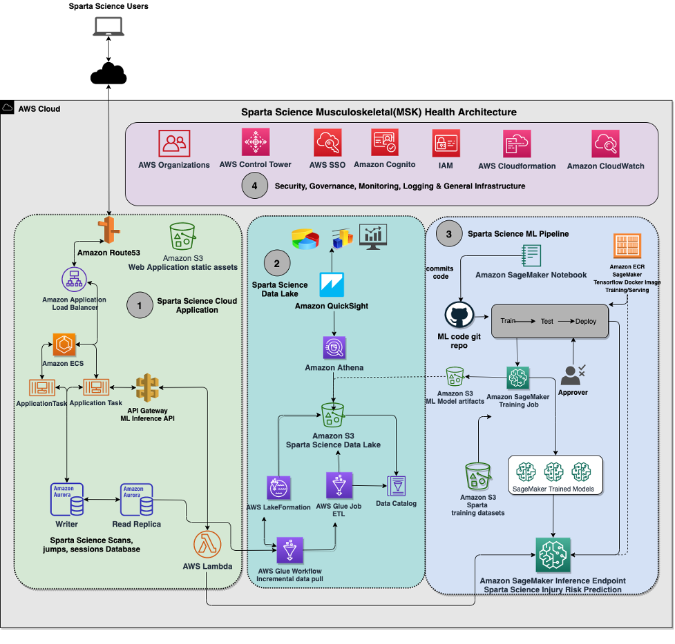 Sparta Science has been collecting and assessing ground reaction force time series data for over a decade from 80k+ unique individuals and from a variety of different population groups (e.g., sport & position, military function etc.). In conjunction with this time series data, we’ve also been collecting injury event, performance measurement, exposure, and exercise activity data. Through the combination of accumulated data, advance machine learning techniques, and domain knowledge brought from a team that includes professional training and medical expertise, Sparta Science is able to deliver a uniquely powerful system for movement health. Delivering this system, however, presented a daunting set challenges for a small company that led us to AWS.