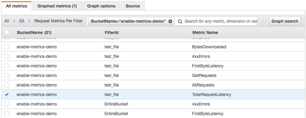To view metrics based on filters, select the BucketName and FilterId. In the screenshot, TotalRequestLatency is selected for the test_file filter on the enable-metrics-demo bucket: