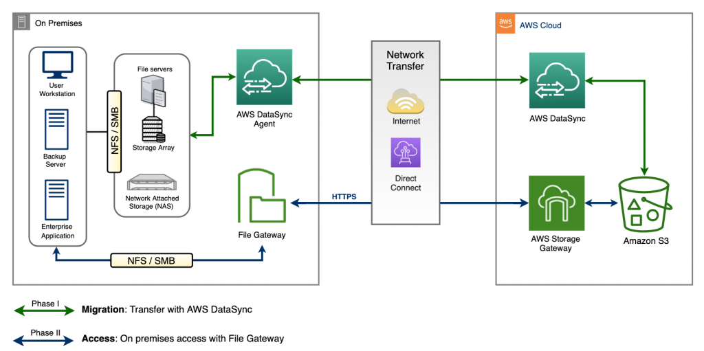 We address this question with a two-phase hybrid approach, where we migrate data and make it accessible to on-premises applications. In the migration phase, we use AWS DataSync to do an initial bulk migration of existing data from on-premises NAS and file servers to Amazon S3. In the access phase, we make the data stored in Amazon S3 easily accessible as an SMB or NFS file share on premises, using File Gateway. In the following diagram, you can see a high-level overview of the proposed two-phase architecture.