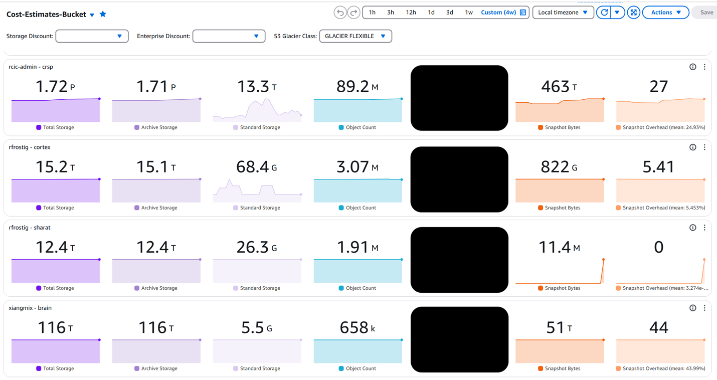 The monitoring system needed to accommodate 50-100 servers operating on independent backup schedules. With end systems being managed by disparate and disjoint administrators, only the data in AWS can be used as a central aggregation point. For cost containment, UCI is most concerned with averages. Some servers may have many small files or significant data churn (resulting in higher percentages of non-current objects) and thus are “more expensive per terabyte.” These are balanced by other servers that relatively large files and/or low data churn and thus are “less expensive per terabyte.” UCI built a custom dashboard in CloudWatch that combines metrics from all backup buckets, teases out different API calls to estimate ongoing cost. The following figure shows a snapshot of this view with a four-week window.