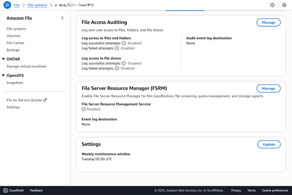 5. It takes several minutes to disable FSRM. During this time, the FSx for Windows File Server file system reboots. Multi-Availability Zone file systems experience an automatic failover and aren’t impacted, while Single-AZ file systems have a brief interruption while the file system is rebooted. We can refresh the page to check the status. When the status changes to Disabled in grey, FSRM has been disabled on the file server.