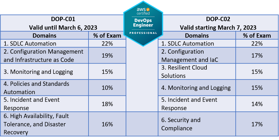 Nothing has been deleted from the current exam outline. However, some things were changed in the new AWS Certified DevOps Engineer – Professional exam content outline (referred to here as DOP-C02 for optimal clarity) and reordered to align with the AWS Well-Architected Framework.