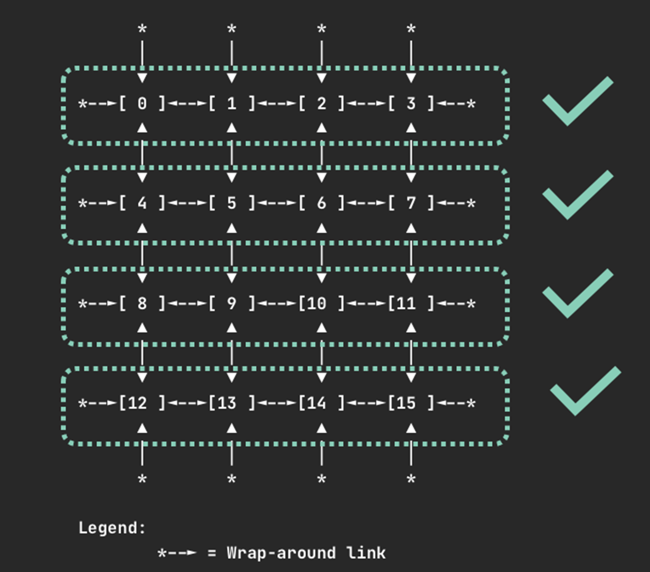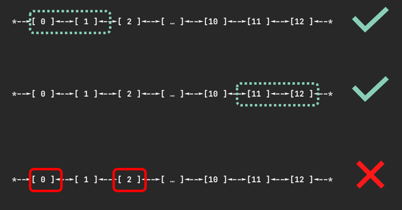 如下方图示,对于一个请求 2 个设备的 Pod,[0, 1] 或 [11, 12] 这样的连续分配是有效的;而 [0, 2] 这样的非连续分配则是无效的,调度器绝不会生成这样的分配方案。这正是通过 continuousDeviceAvailable 函数的循环检查机制来保证的。