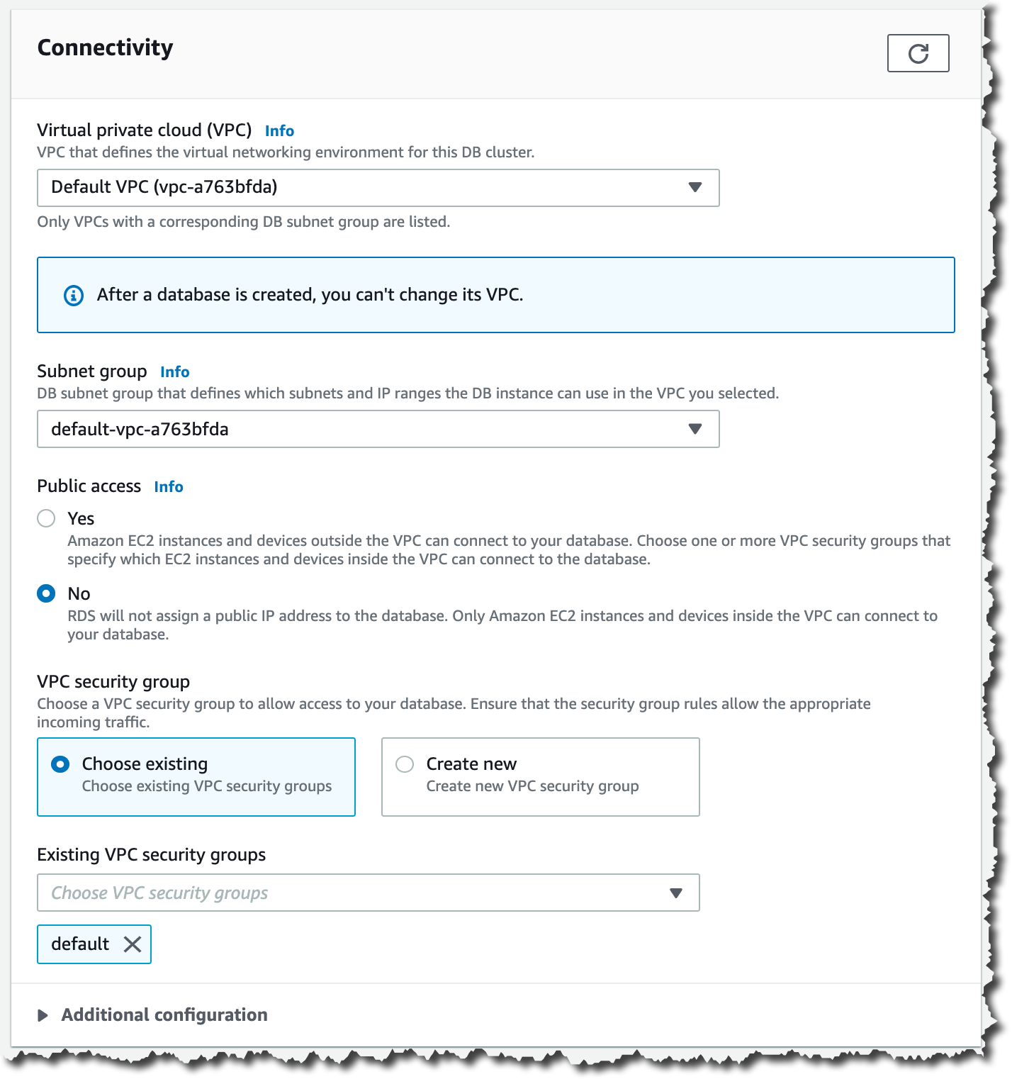 接下来,通过新建 VPC 和安全组或使用默认值来配置连接。最后,选择创建数据库。