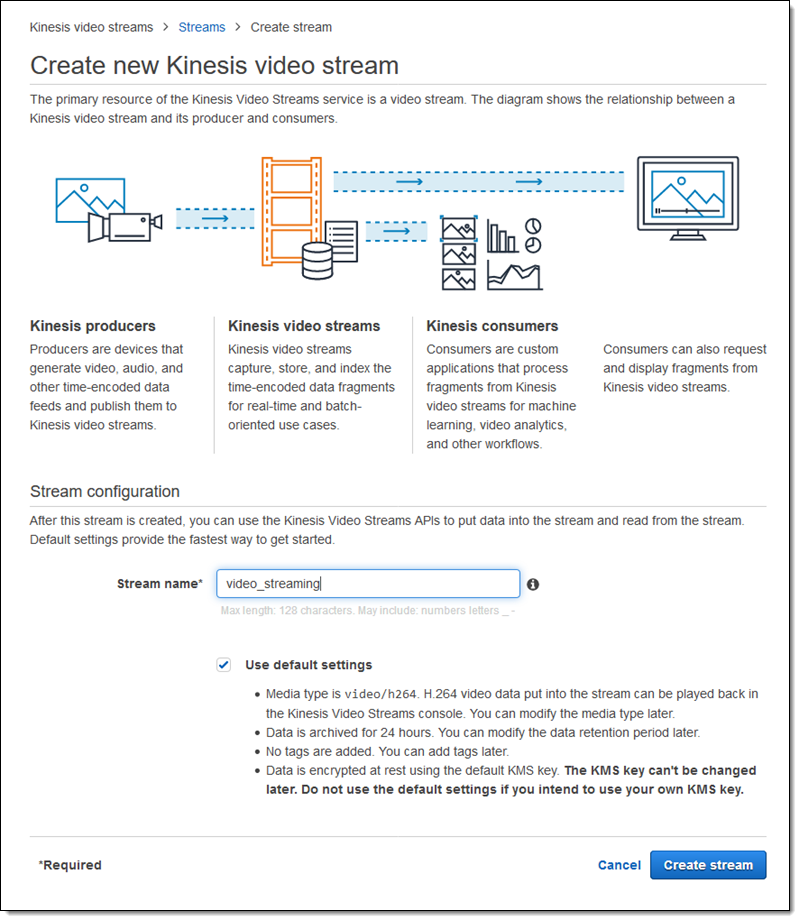 为了手动创建流,我打开 Kinesis Video Streams 控制台并单击 Create Kinesis video stream: