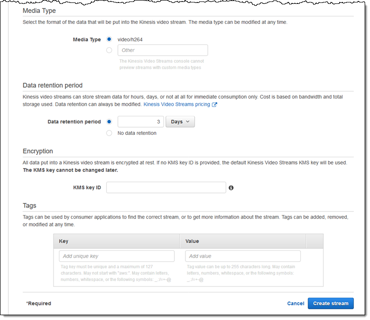如我之前提到,创建器和流之间存在一对一映射。大多数情况下,每个创建器实例将使用 Kinesis Video Streams API 创建一个唯一的流。但是,如果您想进行测试或演示,或者您需要固定数量的小型流,则可手动创建流。