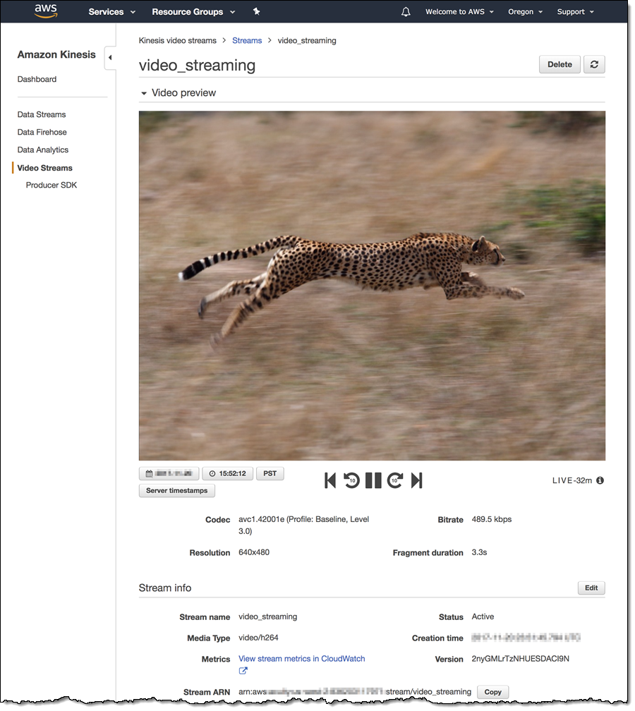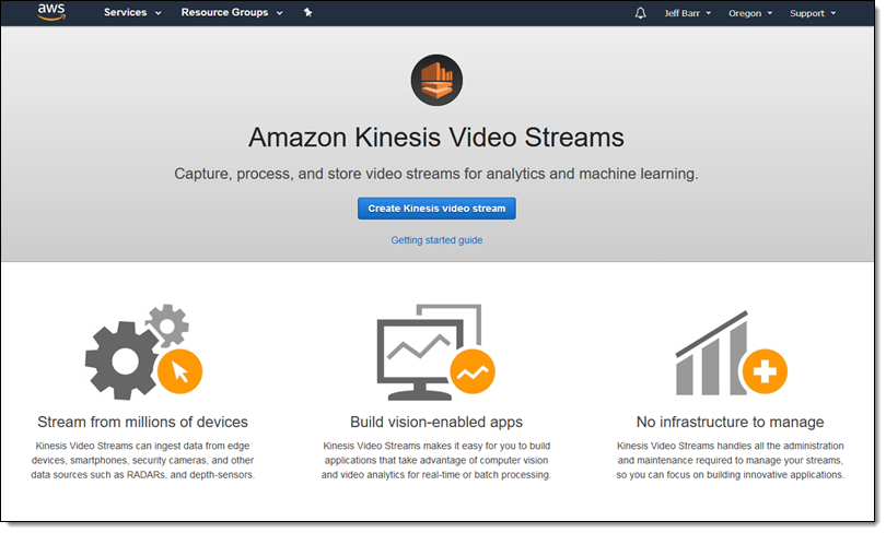 无论您从一台设备还是数百万台设备发送多少低分辨率或高分辨率的视频,Kinesis Video Streams 都将进行扩展以满足您的需求。我总是不厌其烦地说,您可以专注于您的应用程序和业务。Amazon Kinesis Video Streams 基于您熟悉的 AWS 部件而构建。它将视频存储在 S3 中以实现持久性和节省成本,使用 AWS Identity and Access Management (IAM) 进行访问控制,并且可通过 AWS 管理控制台、AWS 命令行界面 (CLI) 和一组 API 进行访问。